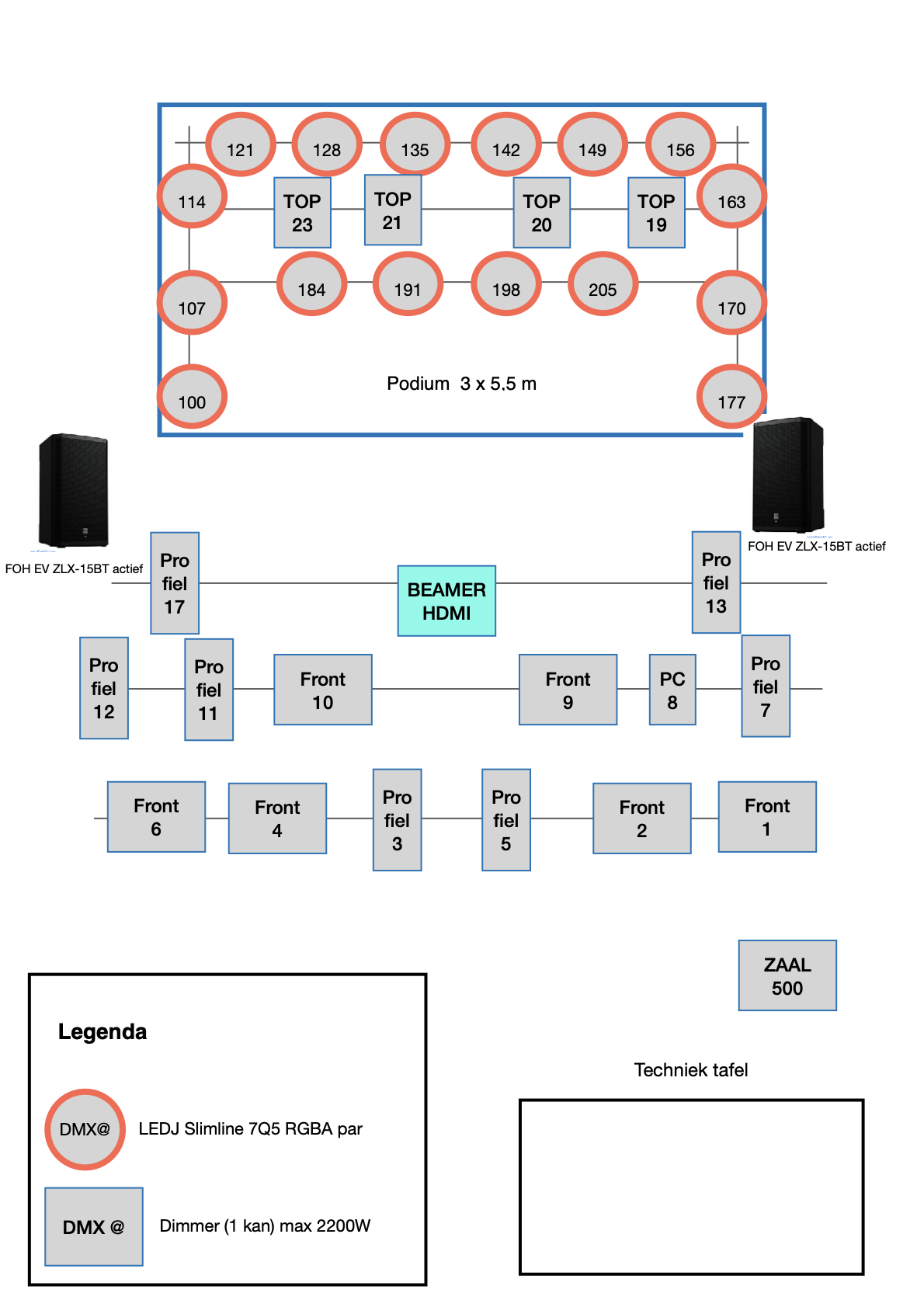 | 107 | PAR RGBA (7 kan) | – | Led zij links midden | LEDJ Slimline 7Q5 RGBA par | 45 |